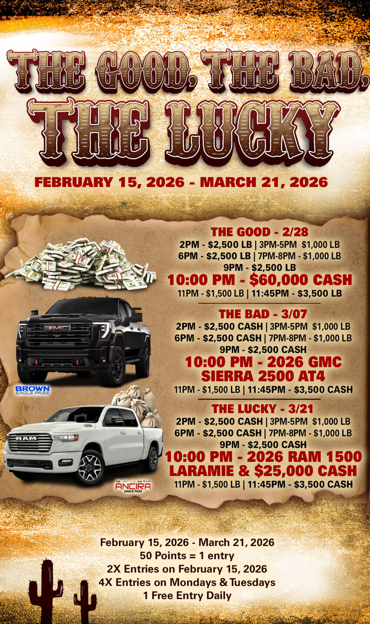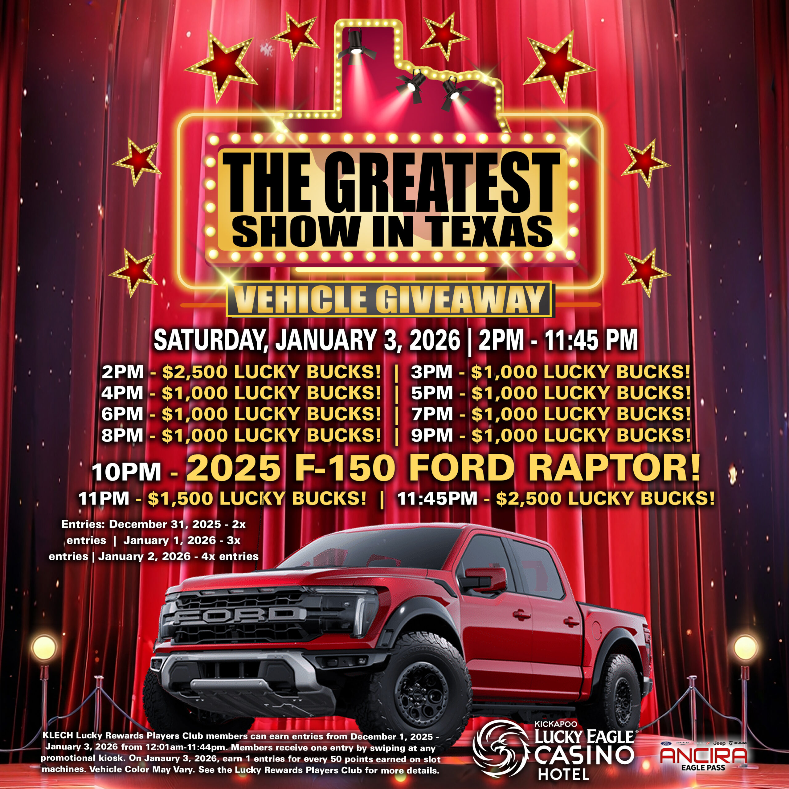 At Kickapoo Lucky Eagle Casino Hotel, We Love Winners! Our guests don’t just play—they win big, with millions of dollars in jackpots paid out each month and exciting chances to win. From luxury vehicles to cash prizes and Lucky Bucks in our monthly giveaways, the excitement never ends!