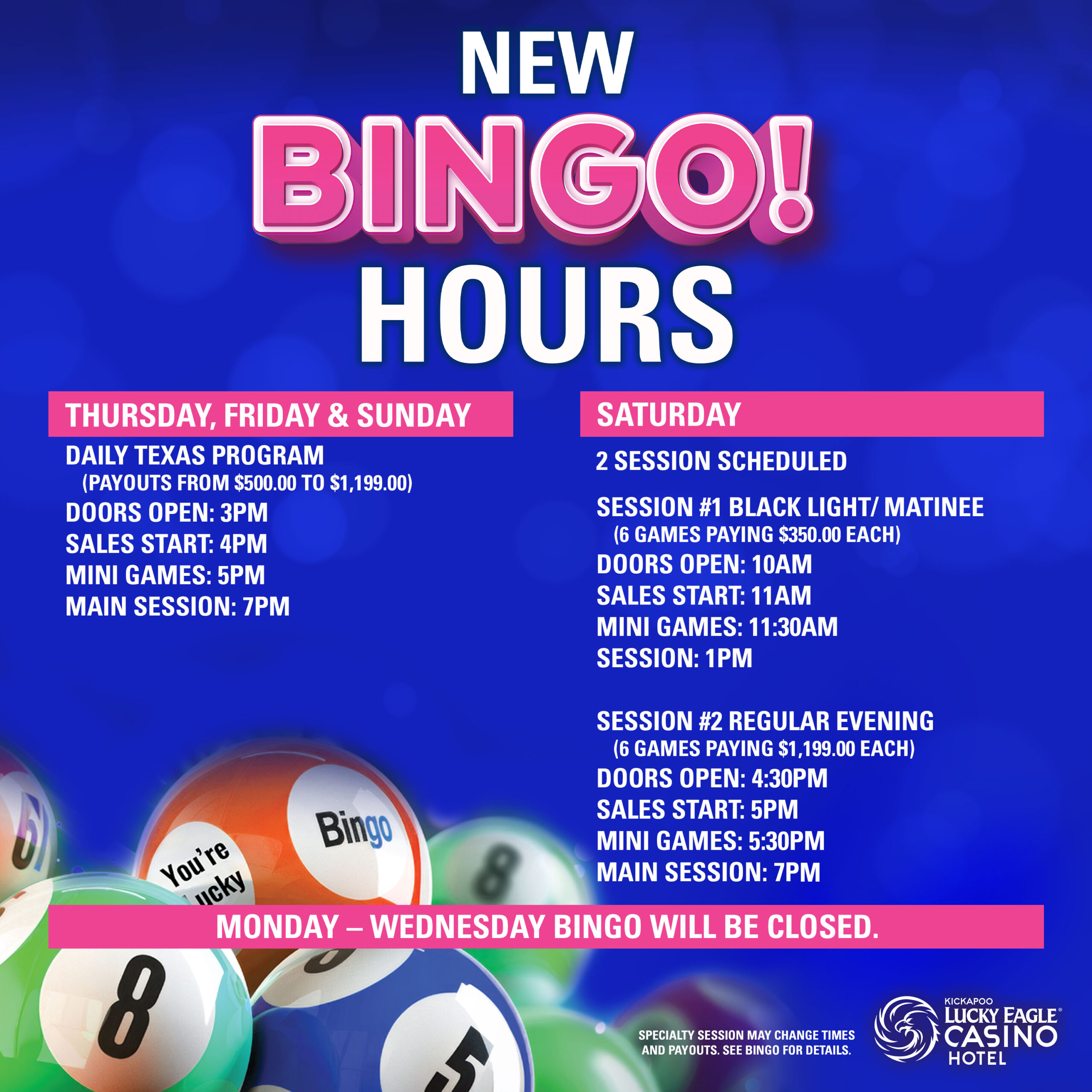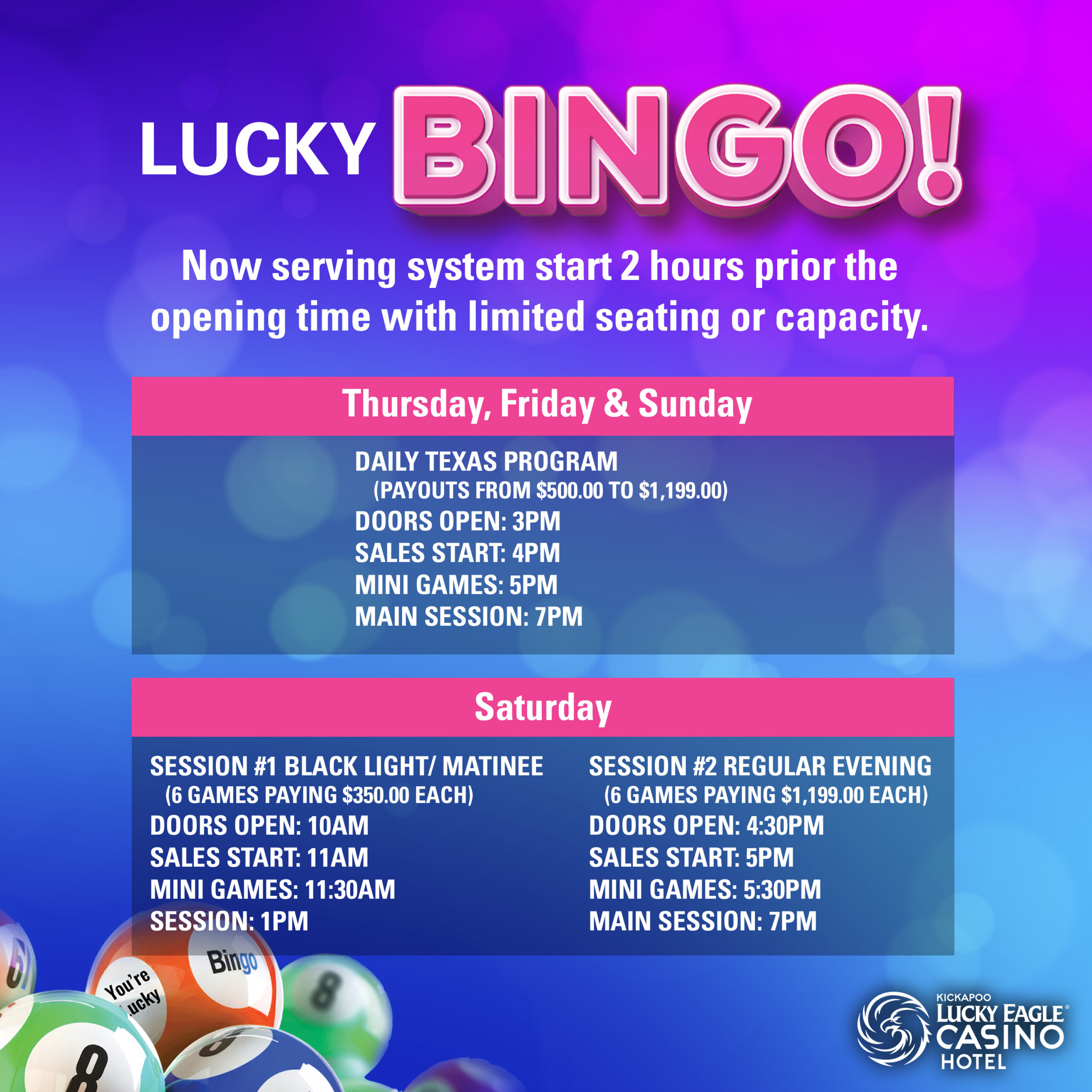 Every Wednesday, Thursday, Friday and Sunday, guests using their Lucky Rewards Card at the time of purchase are eligible to receive a 20% off discount on their Bingo Buy-In.
