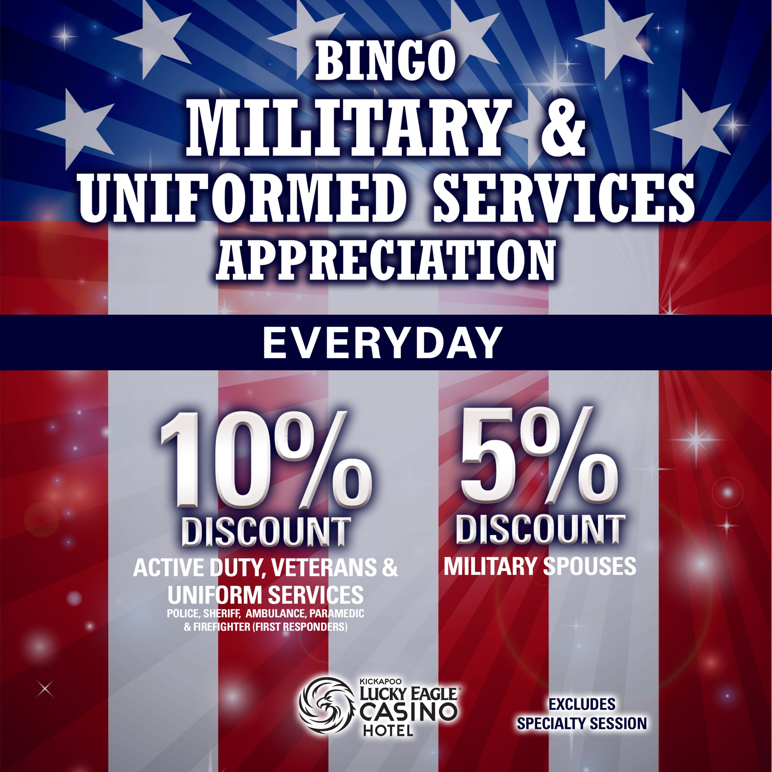 All Veterans, Military Spouses & Active Duty are eligible to receive a discount on Bingo Buy-Ins everyday.